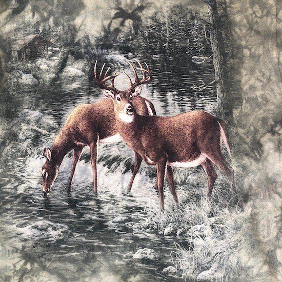 山中のシカ2頭をプリンティング。ハンター目線から描いた構図でしょうか、1頭は逃走の合間に乾いた喉を潤わせており、もう1頭は索敵している様子にも見えます。