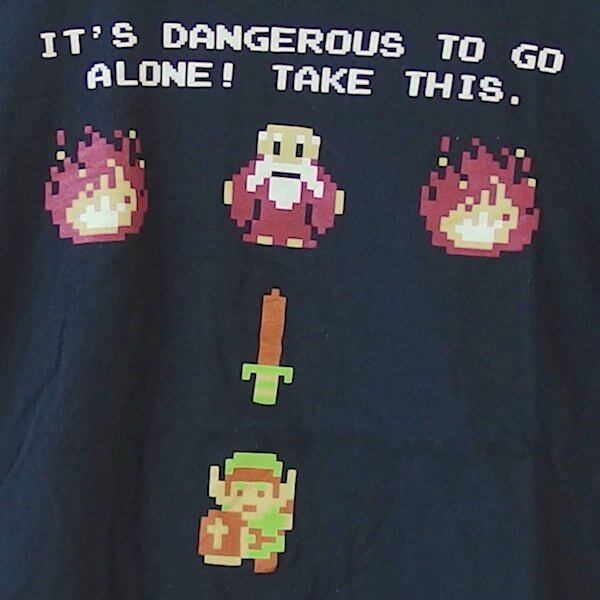 ゲーム中、主人公のリンクに老人が剣を授けるシーンがありますが、その場面を切り取ったTシャツがこちら。「It's Dangerous to go Alone」というセリフは、以降のゼルダシリーズでもお馴染みになっています。