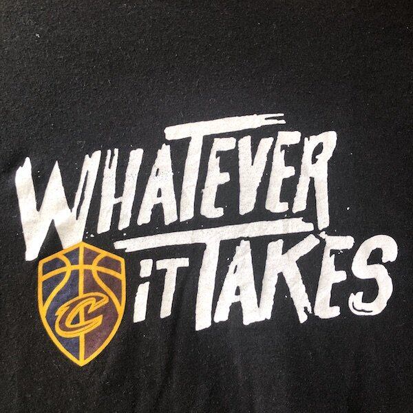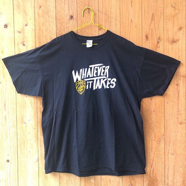 本Tシャツは、レブロンがキャブスで過ごしたラストシーズン、つまり2017-2018シーズンでプレーオフに進出した際に制作されたもの。胸にプリントされた「WHATEVER IT TAKES」というスローガンは、「何としてでも」という意味で、「プレーオフを勝ち抜き、NBAタイトルをもぎ取るのだ」という決意の現れであることは容易に想像できます。